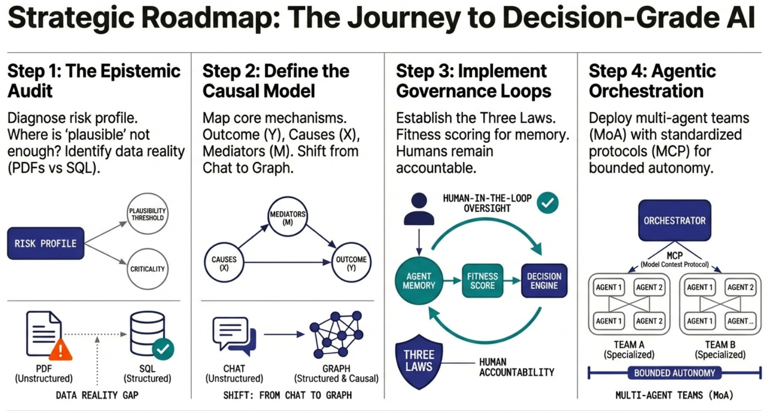 For high-stakes domains, “a plausible answer” is a liability. We help teams move from probabilistic demos to auditable systems: causal graph memory, enforceable governance, and reasoning traces you can inspect.
